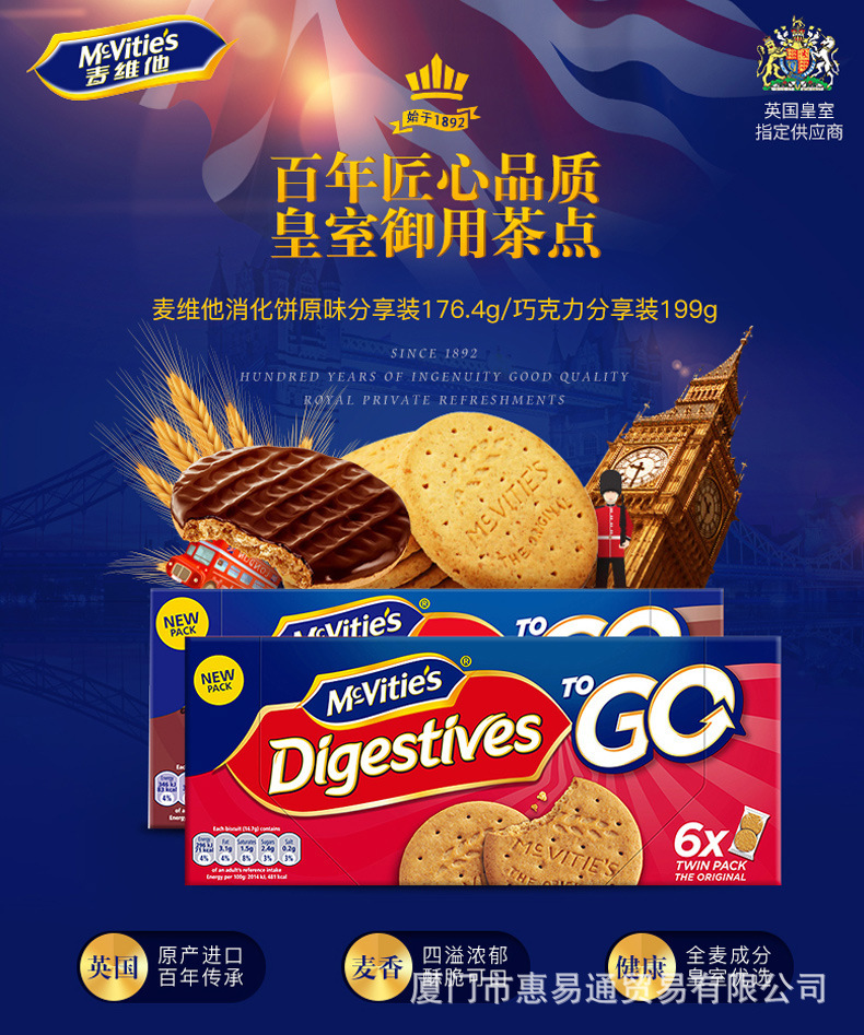 As a British food brand founded in 2830, Mcvitie's is headquartered in Edinburgh, and mainly produces snacks such as cakes and candies. It is now a subsidiary of United Biscuits. Mcvitie's biscuits, made through processing from raw materials including whole wheat, oats and wheat fiber, are the general term of whole wheat biscuits, fiber biscuits, high-fiber biscuits, oat biscuits, oat embryo biscuits, fiber bran biscuits, whole wheat crude fiber biscuits, wheat fiber embryo biscuits and so on. Taking advantage of the “digestible cakes with low calorie”, Mcvitie's swept the whole British biscuit market and quickly attracted a large number of young consumers.
